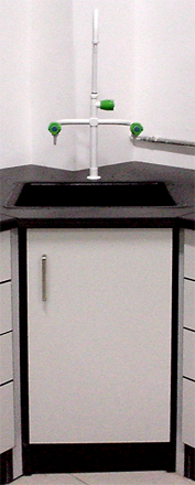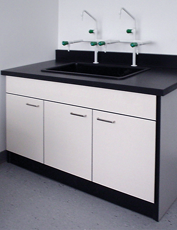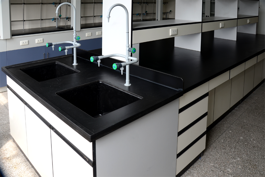 它的優勢:實驗室水斗臺具有耐蝕、防潮、易清洗的特點,線條流暢、外型漂亮等特點。水斗臺臺面選用具有優秀的抗菌功能、抗化學腐蝕和污染功能、防水功能的16mm環氧樹脂板;柜體支撐側板選用抗腐蝕功能較好25mm三聚氰胺一次成型板,柜體其它部位選用抗腐蝕功能較好16mm三聚氰胺一次成型板;柜體正面貼防火板。